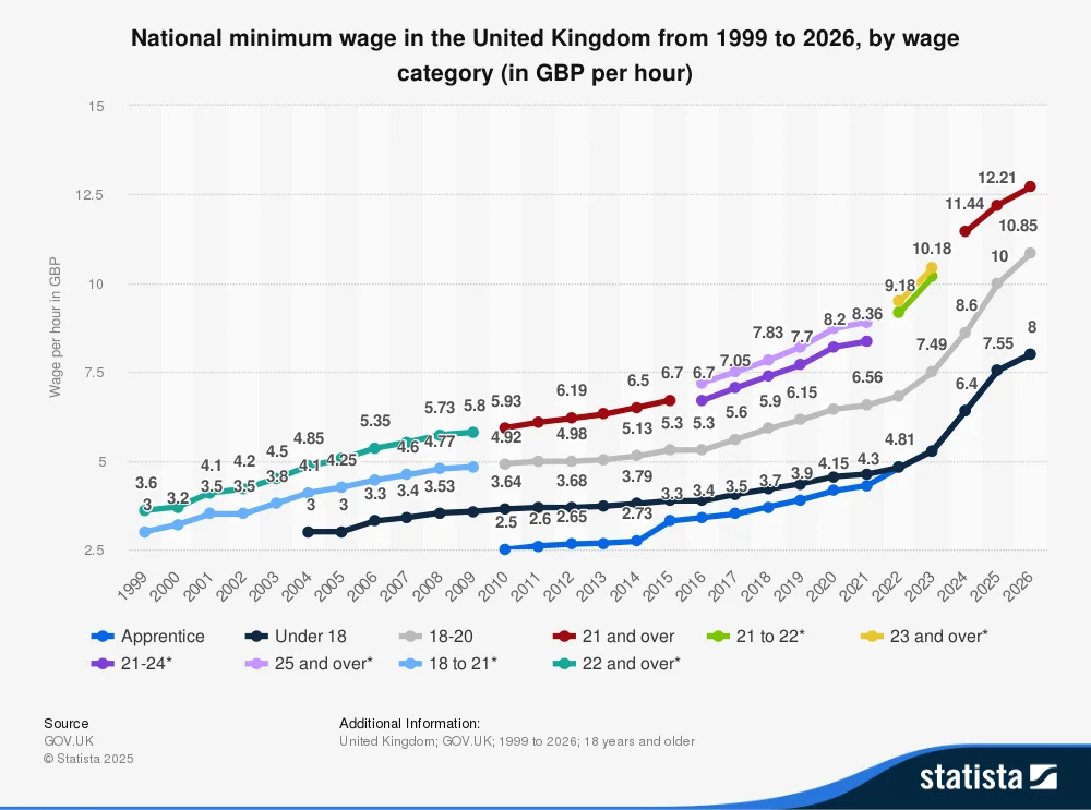 - In April, the minimum wage for people 25+ was £8.72. From April 2026, this will increase to £12.71 (+4.1% from the previous year) for those aged 21+. For employees aged 18- 20, this will increase to £10.85 (+8.5%).